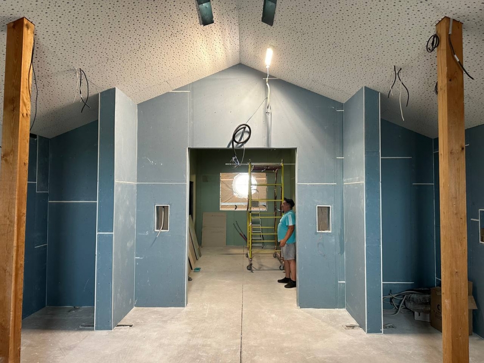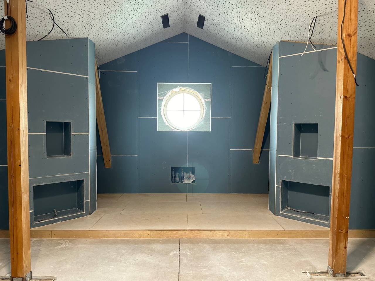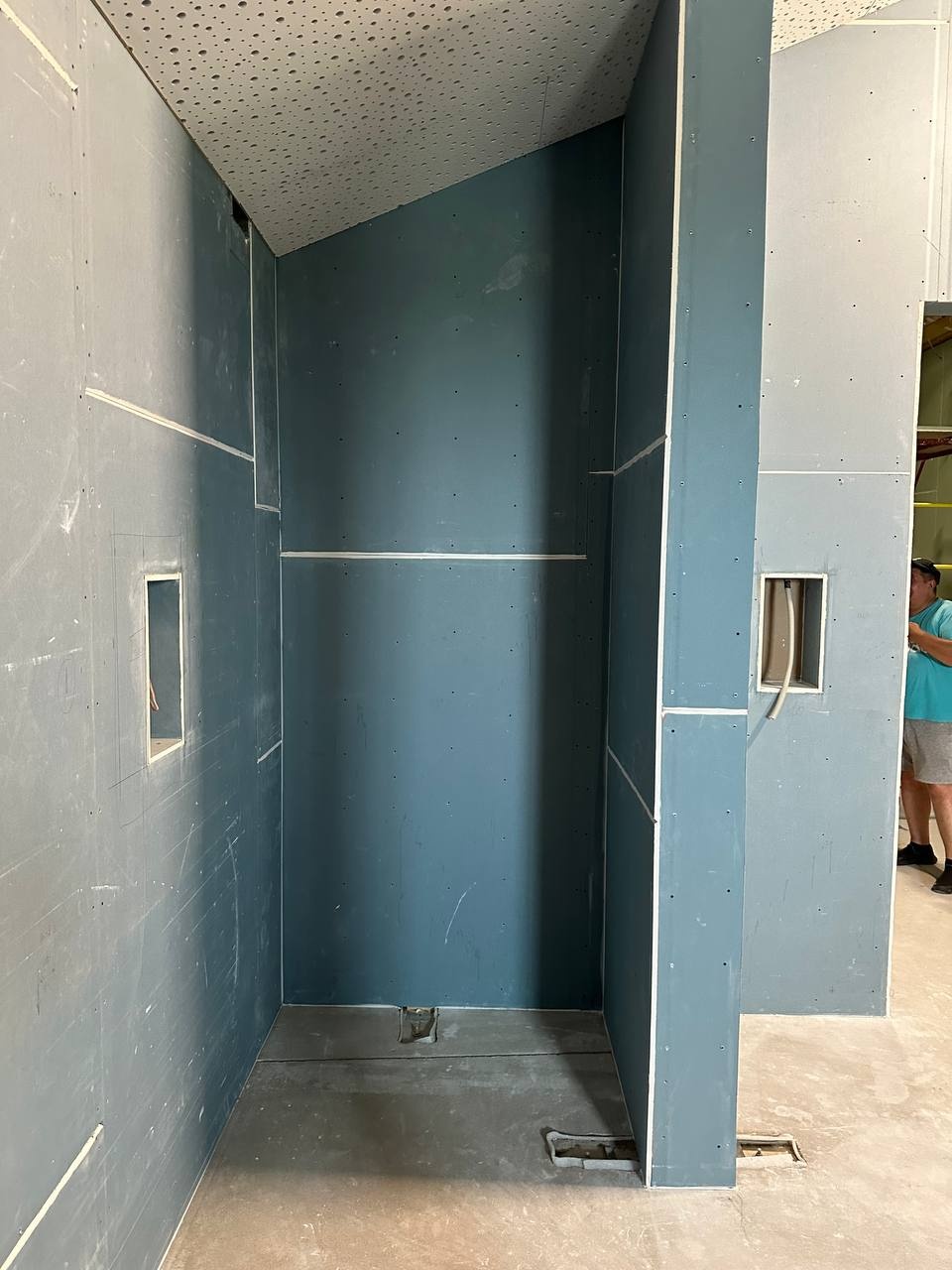 Произведен монтаж каркасных облицовок стен и потолка, а также зашивка потолка акустическими панелями Саундлайн-акустика поинт